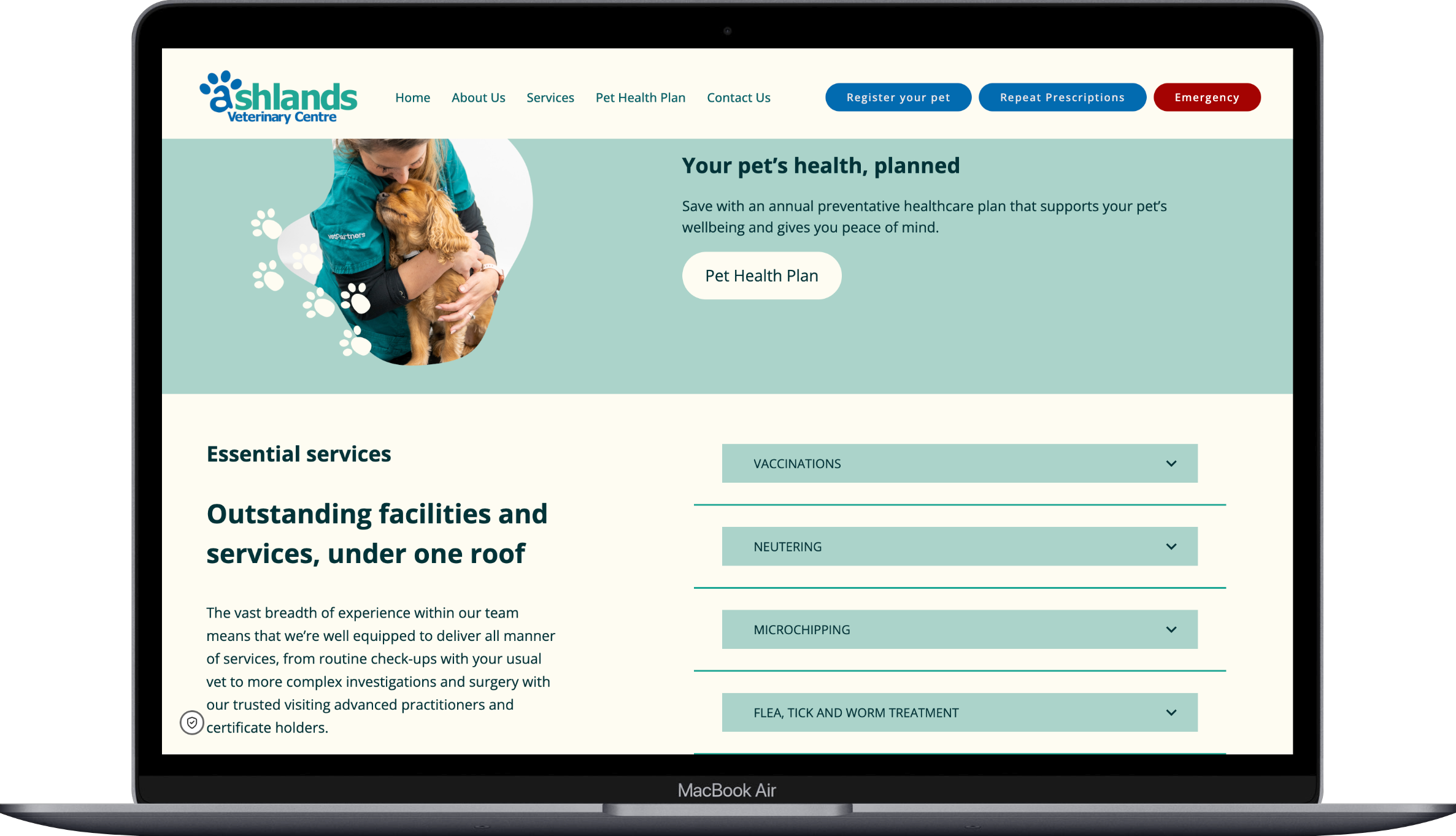 Using insights from GA4, Hotjar and Google Search Console, alongside competitor research, it became clear that existing landing pages for individual services (such as microchipping or vaccinations) attracted very little organic or internal traffic. Based on these findings, the new template was strategically designed to consolidate service content into more comprehensive sections on the VetPartners UK website. Links were then added between practice and coportate pages to boost SEO visibility and increase brand awareness.